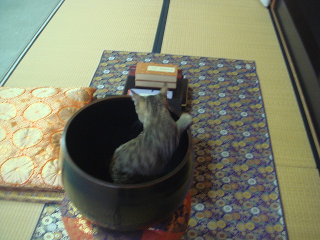 磬子の中に入ってますねぇ(^^)音に影響しないか心配ですが、中に入り込んでいる猫が可愛いです(^^)