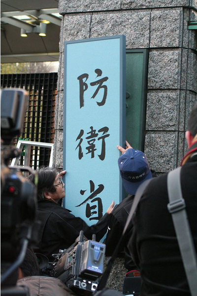 旧防衛庁の看板の上に仮止めされた。