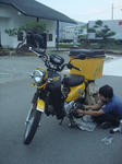 8月16日の夜中に寺でパンクを修理していた寺道君。