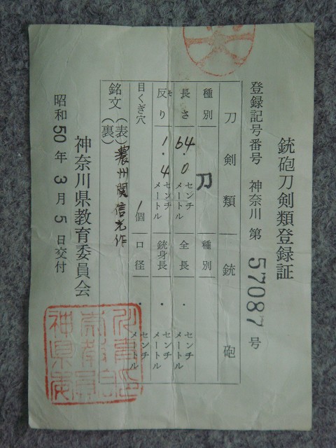 都道府県の教育委員会が発行している銃砲刀剣類登録証。