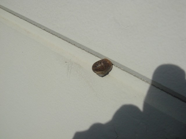 寺務所のドアを開けたところに一匹のカタツムリ。